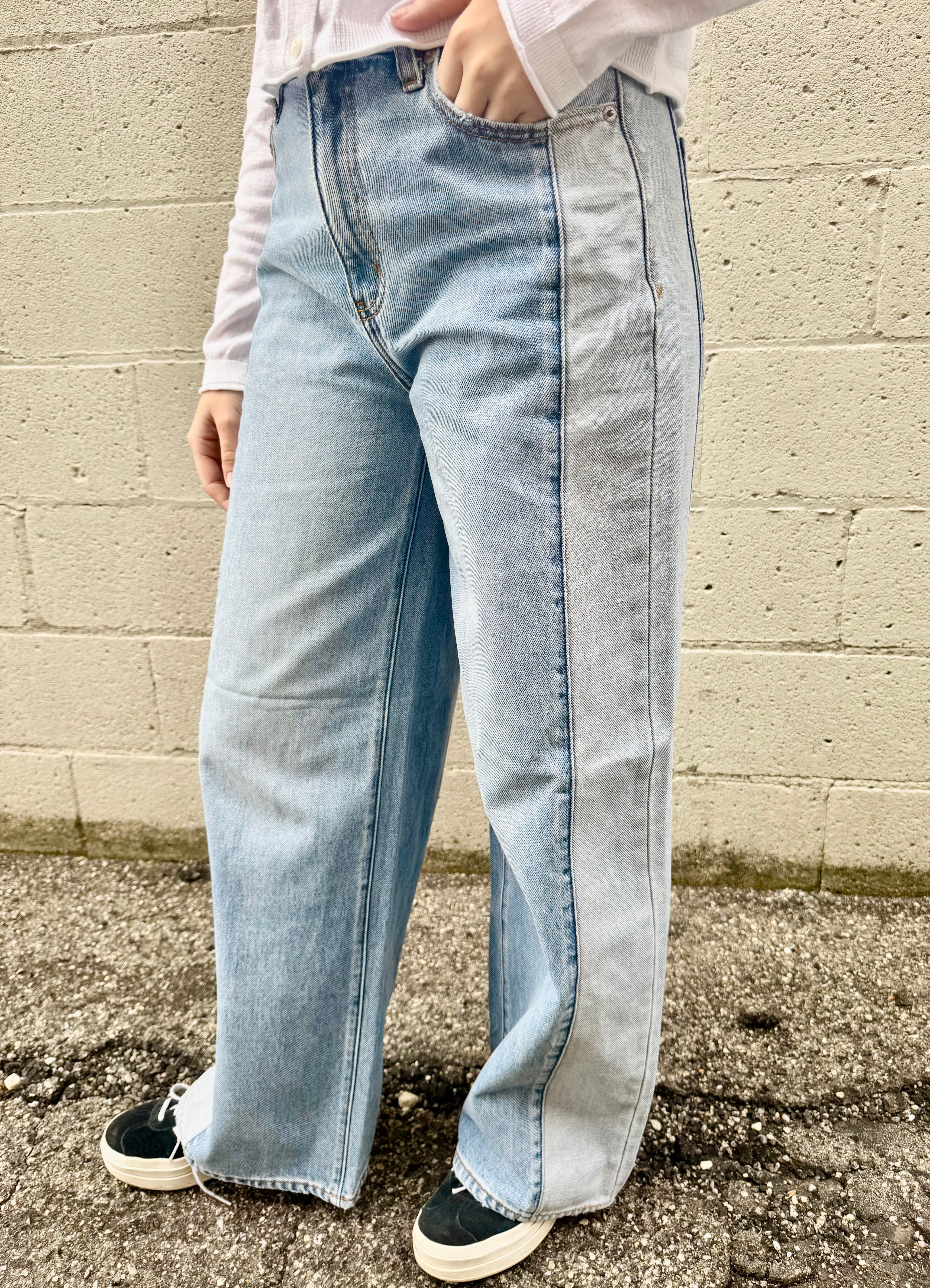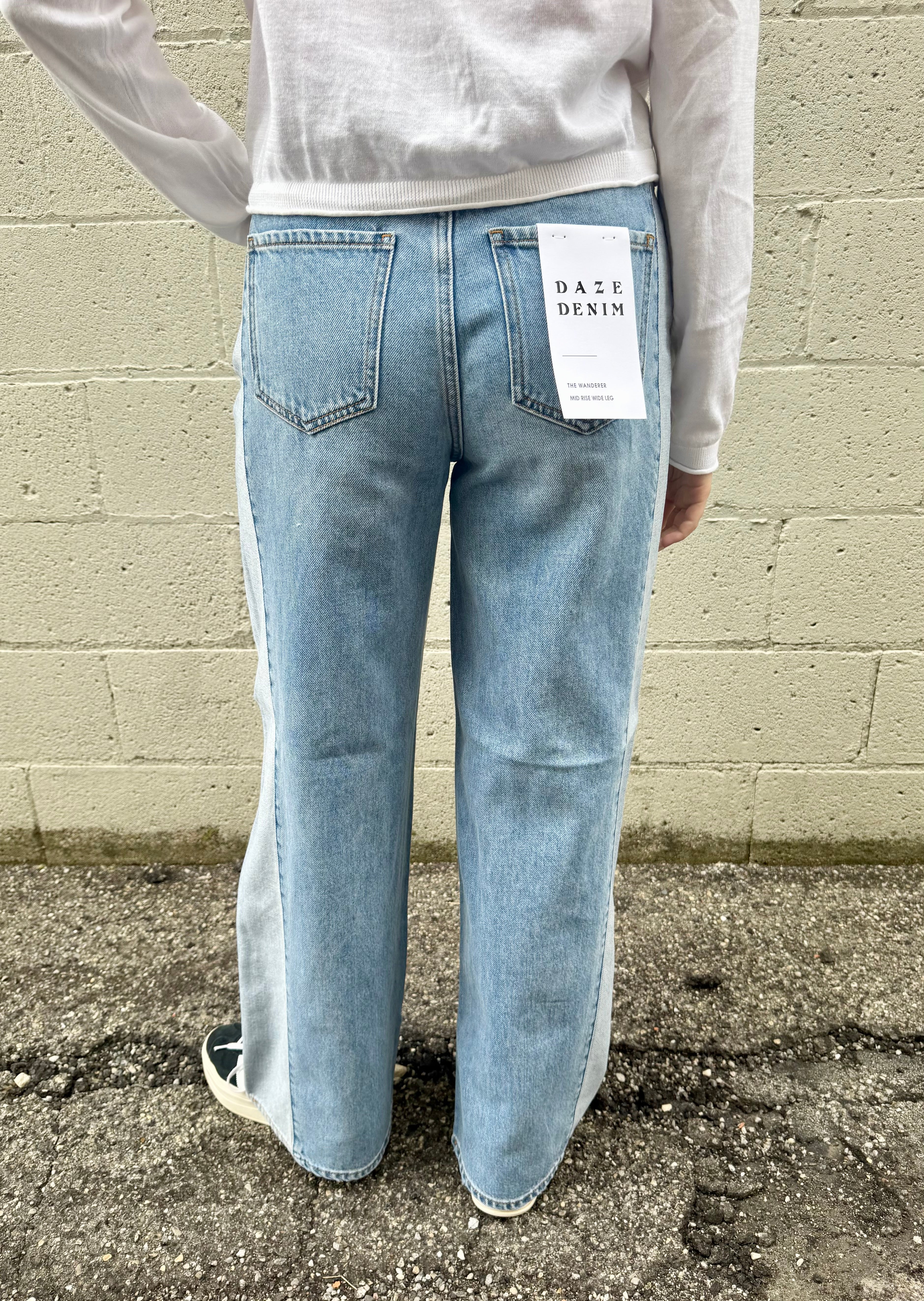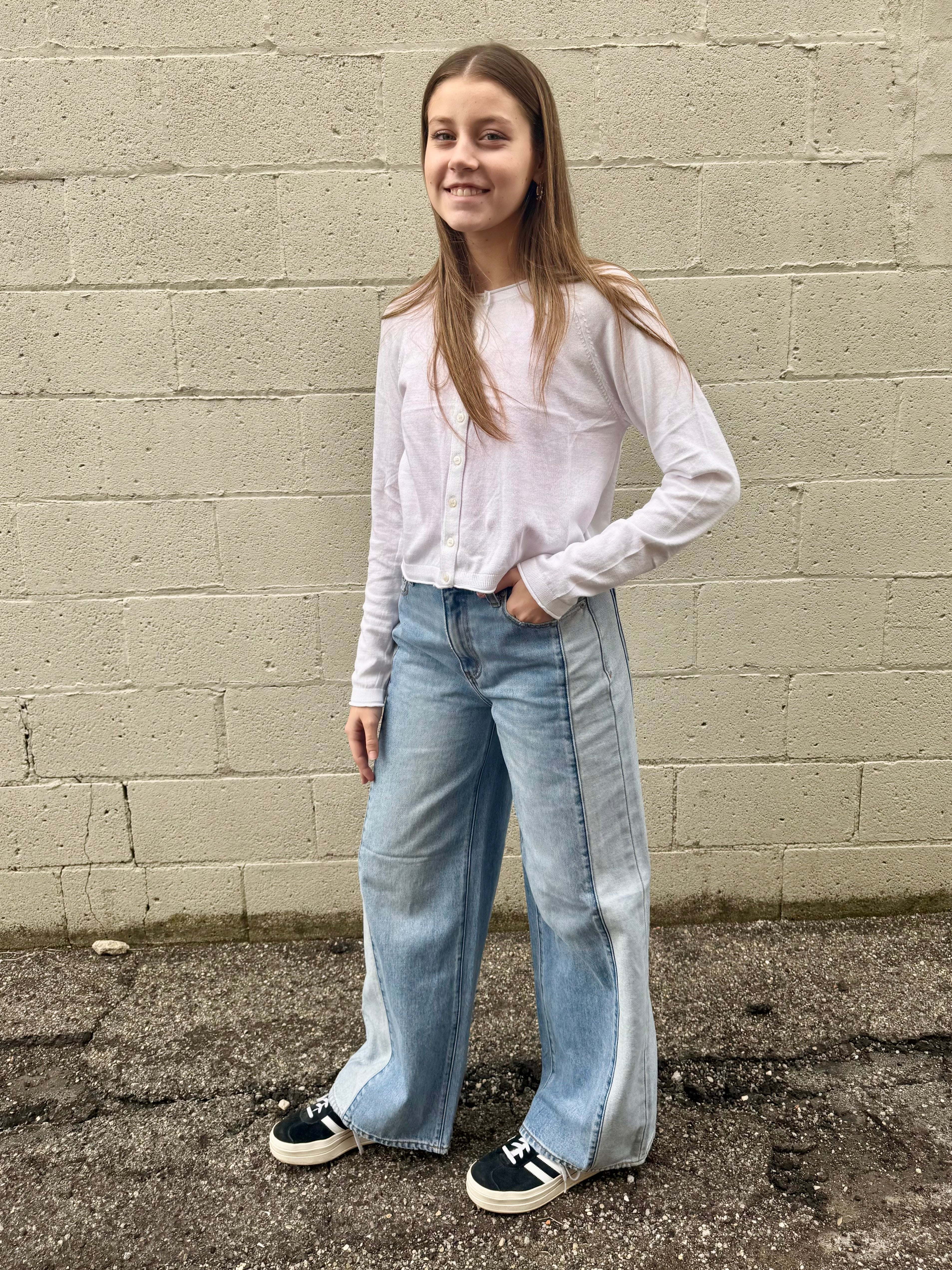 The mid rise palazzo denim brings the drama in the best way. The waist sits comfortably relaxed, then opens into an easy wide leg that is elevated and effortless all at once. The vintage-inspired wash gives that sun-faded, well-traveled look, while the rigid denim keeps the silhouette clean and structured.