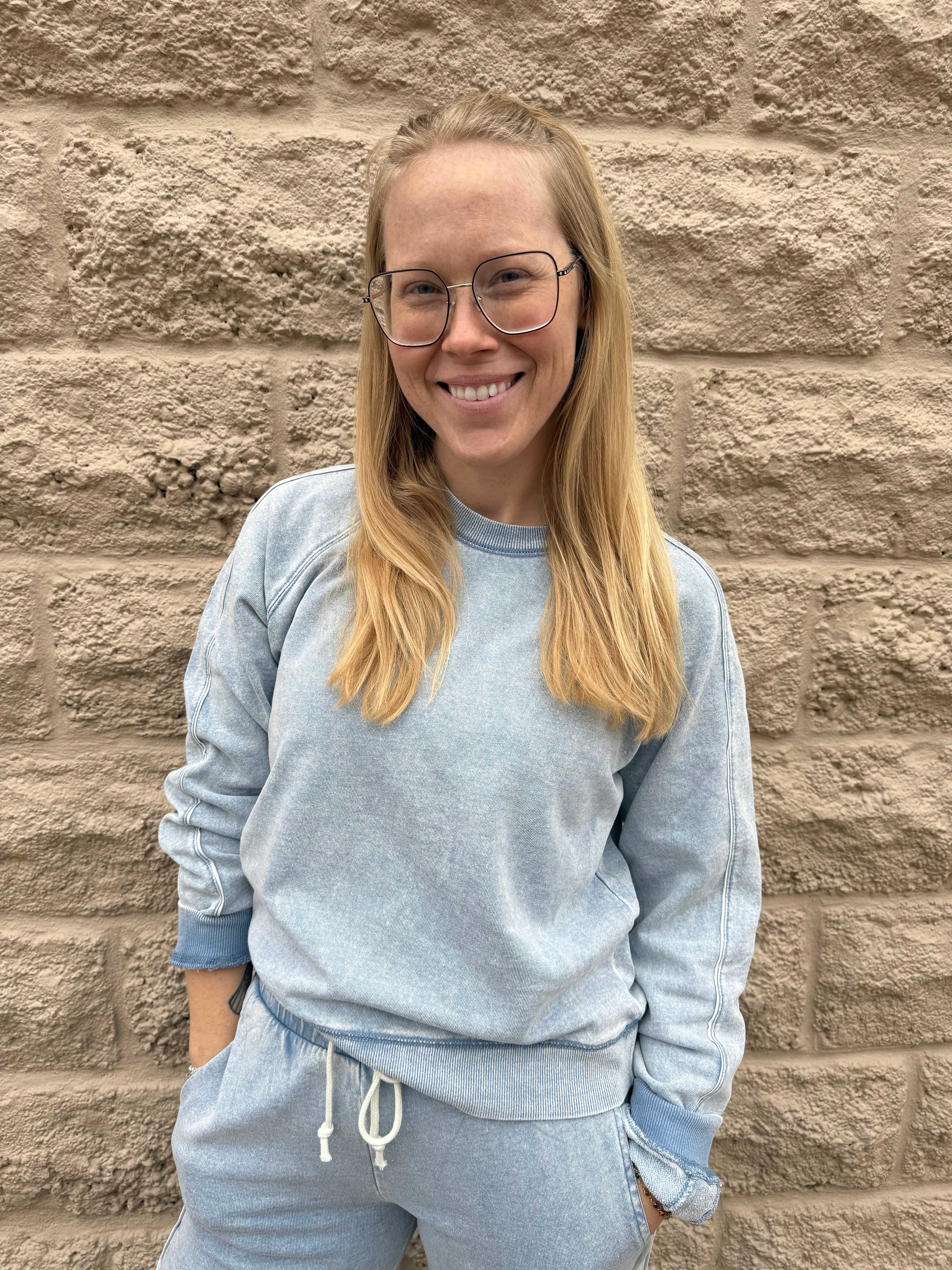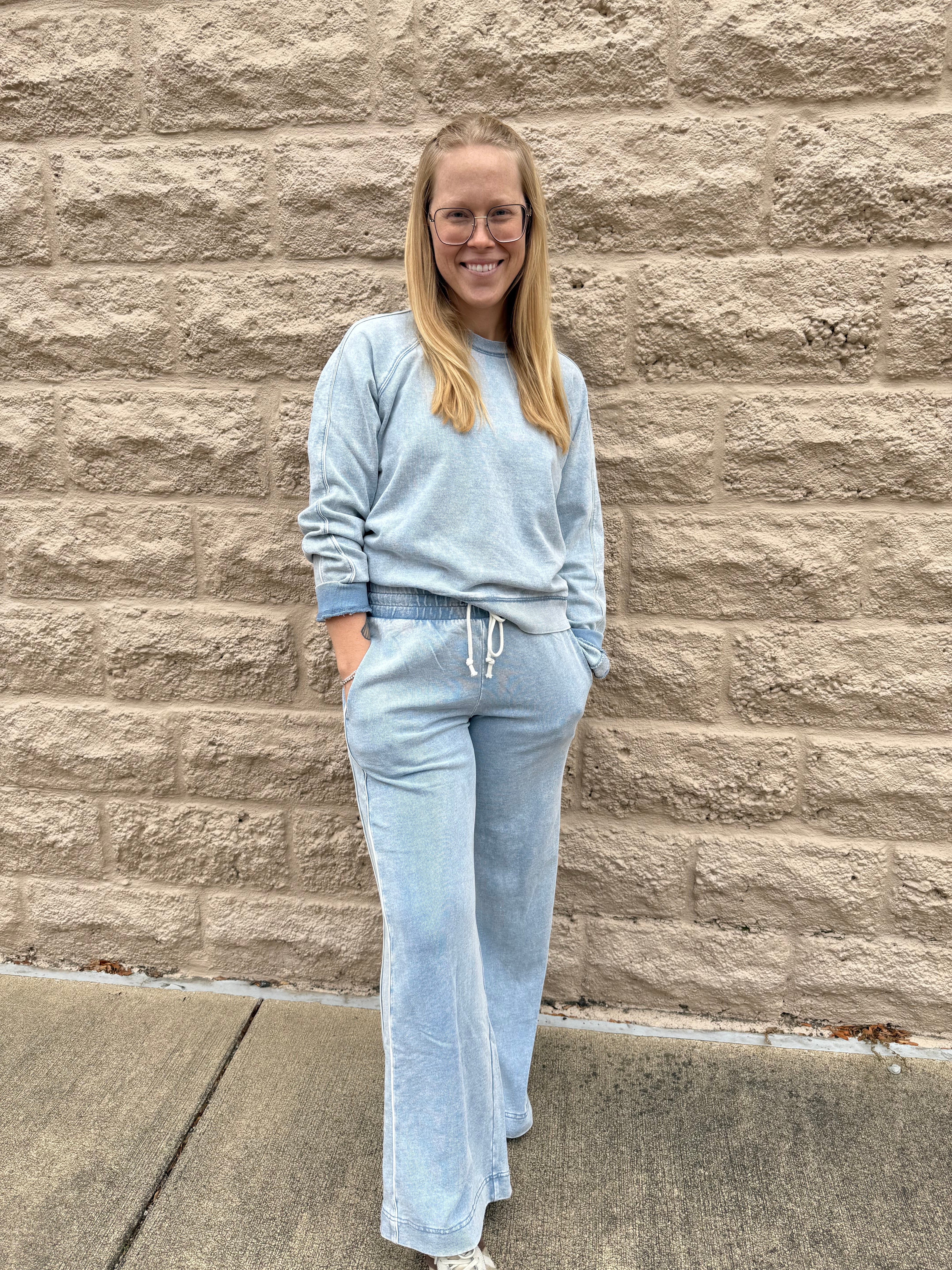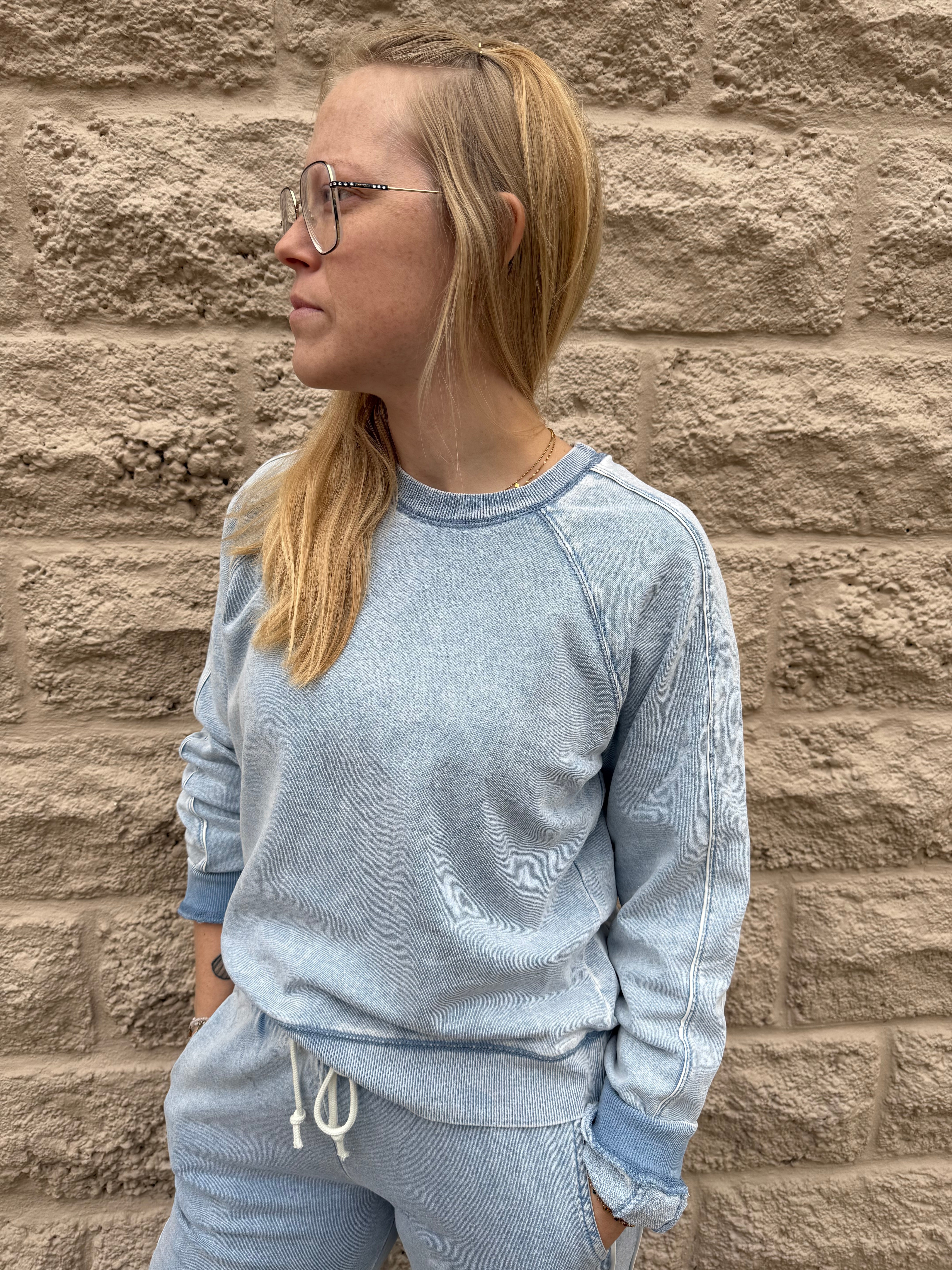 This washed indigo crewneck sweatshirt made of midweight knit denim french terry is your perfect travel companion. It's comfy yet stylish, making it ideal for long flights and layovers. Each one is handcrafted, giving it a unique character that sets it apart from the rest.