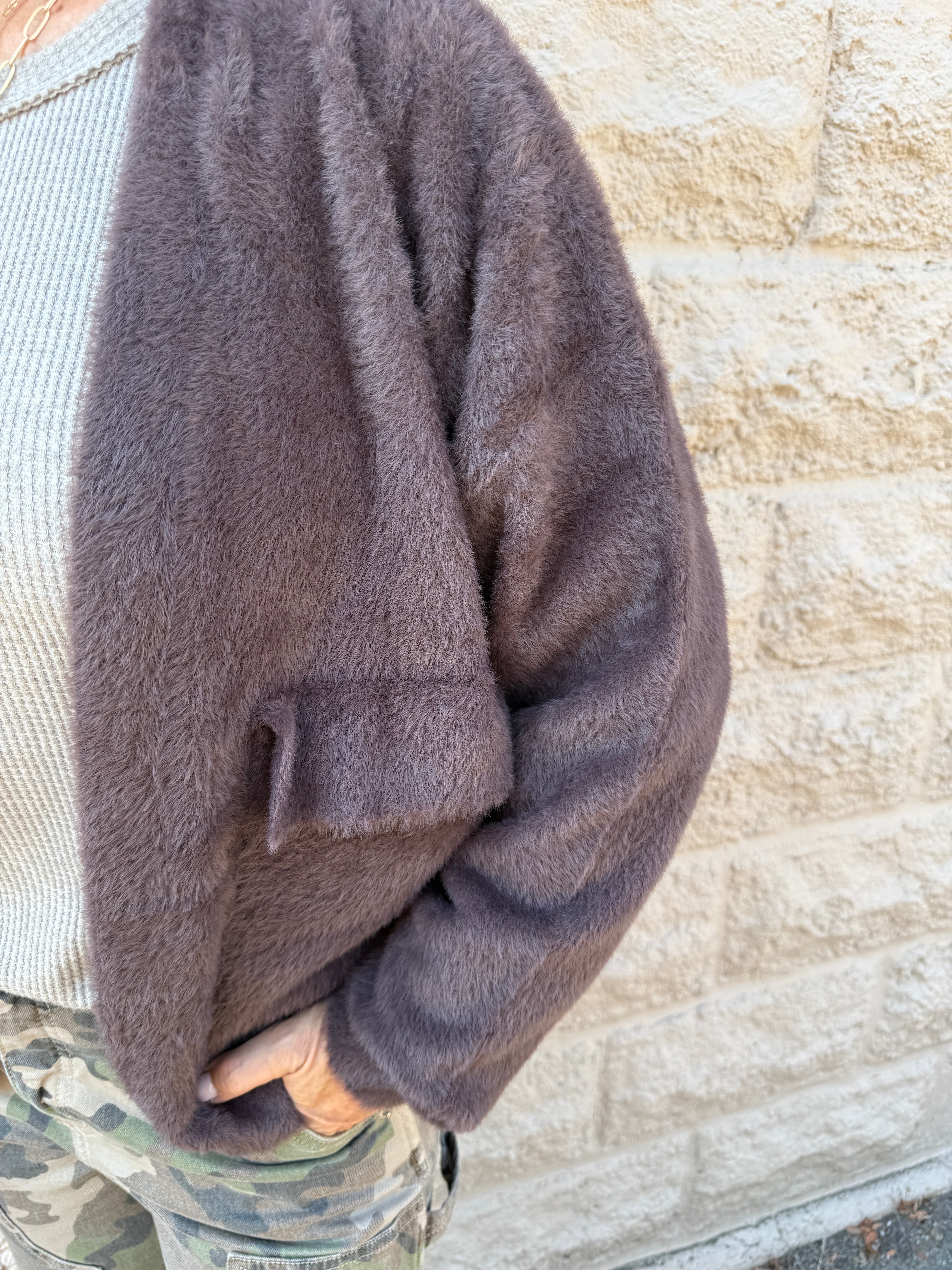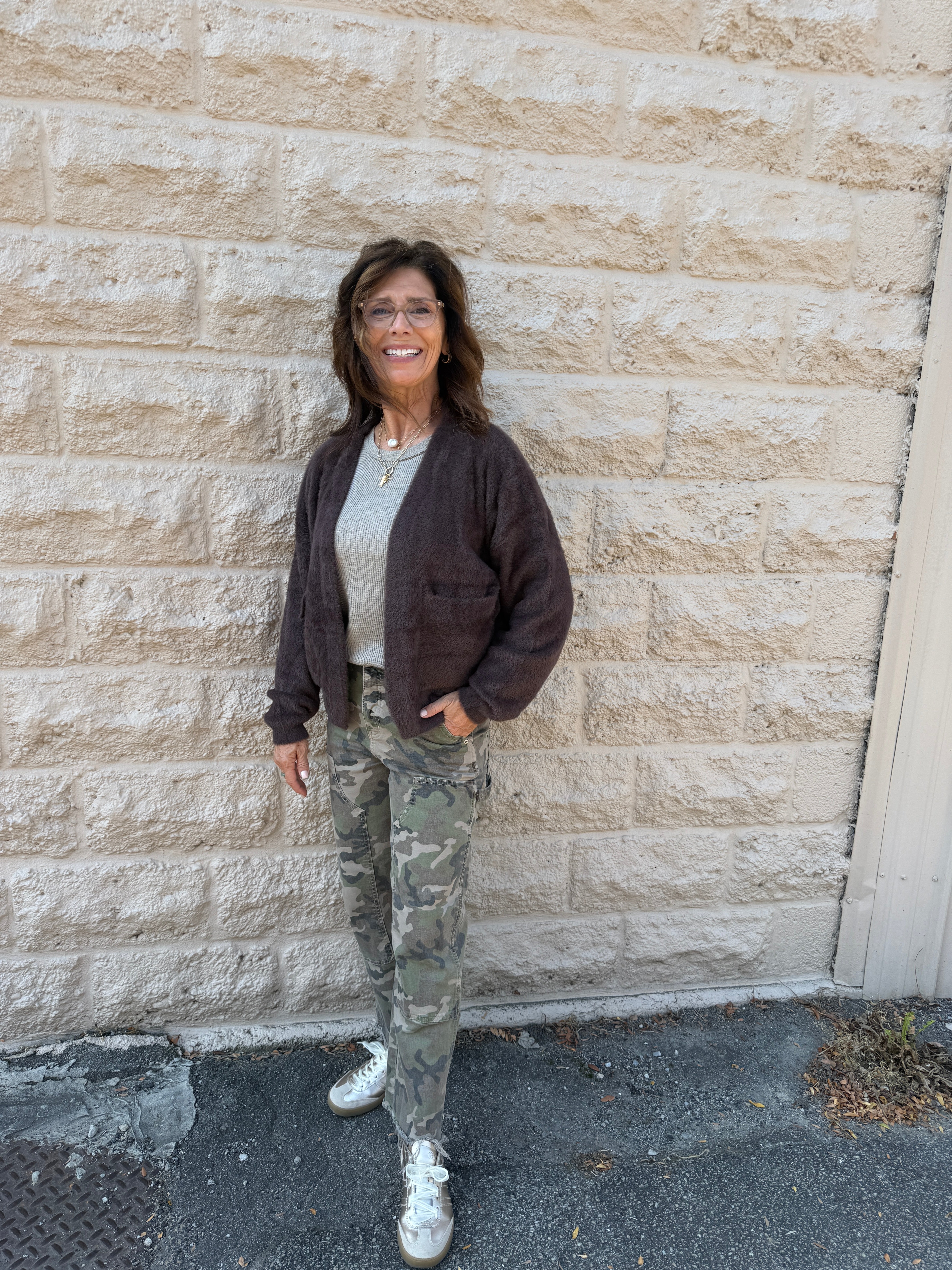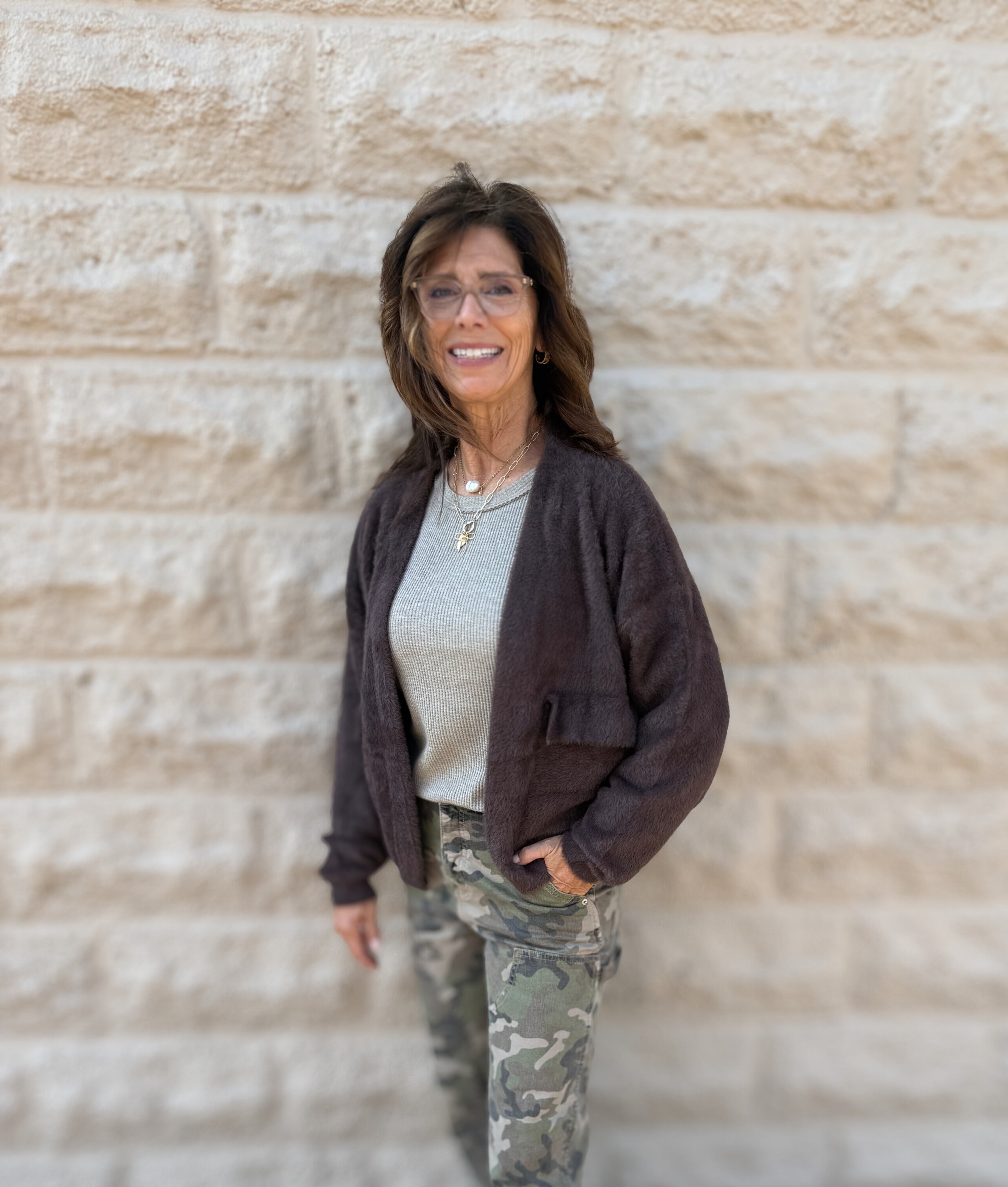 This eyelash knit cardigan is perfect for those cooler months. The military style pockets and perfectly draped neckline, makes this a closet staple!