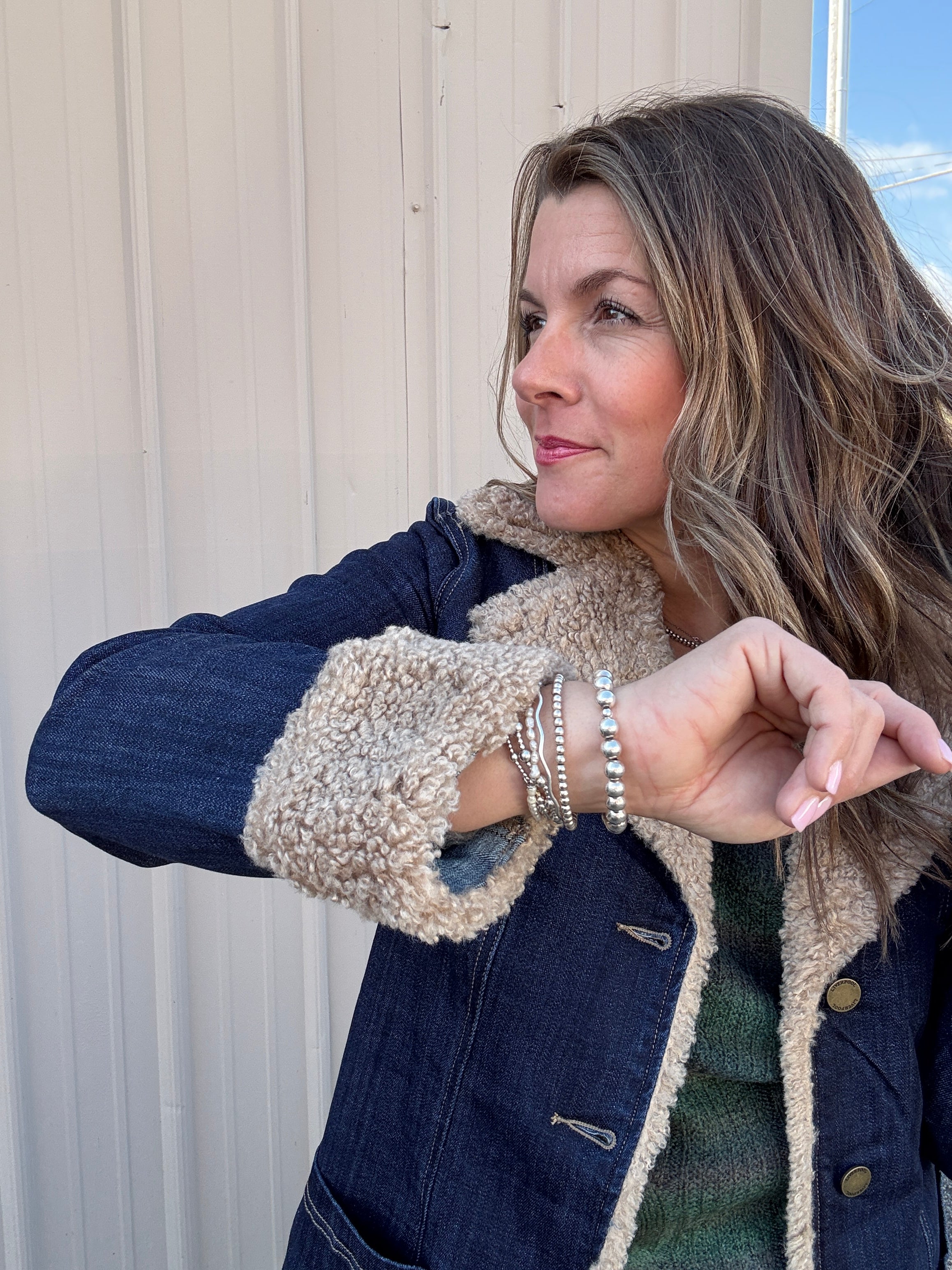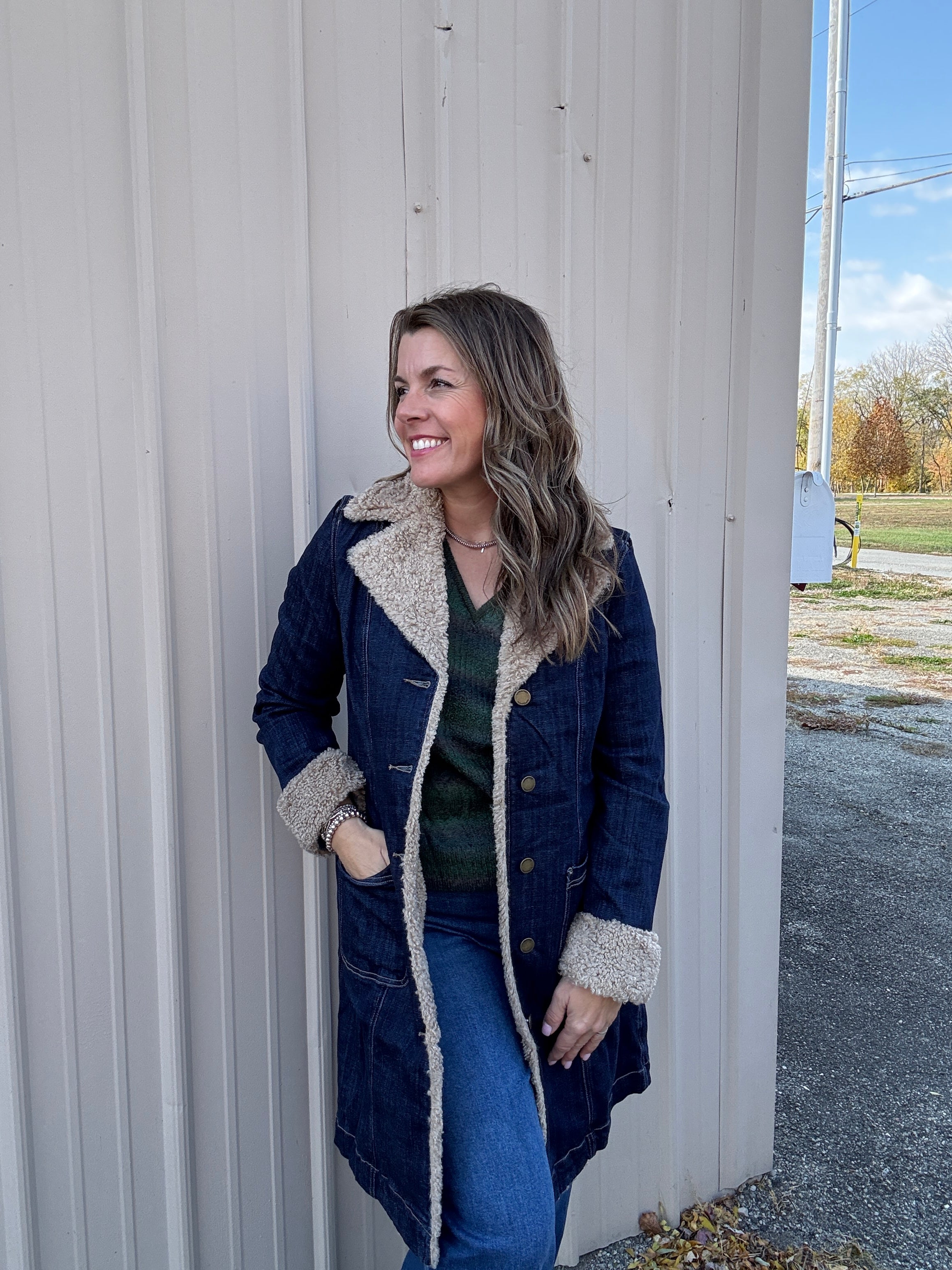 In a flattering longline silhouette, the Long Trucker Jacket in Centerbrooke wash adds structure and versatility to any look. Finished in a rich indigo hue, it styles effortlessly over dresses, denim, or tailored trousers.