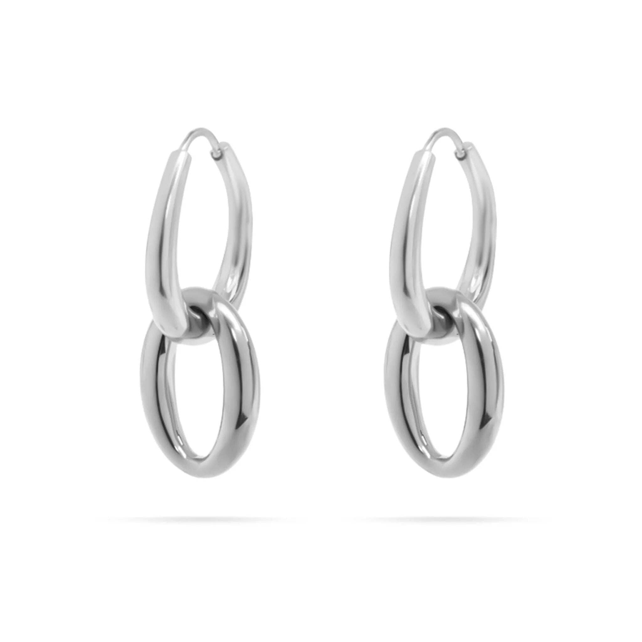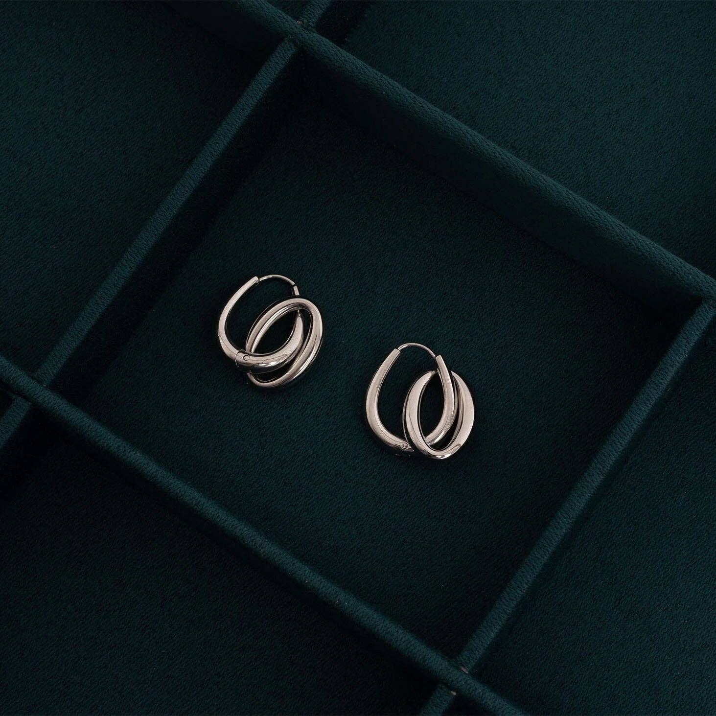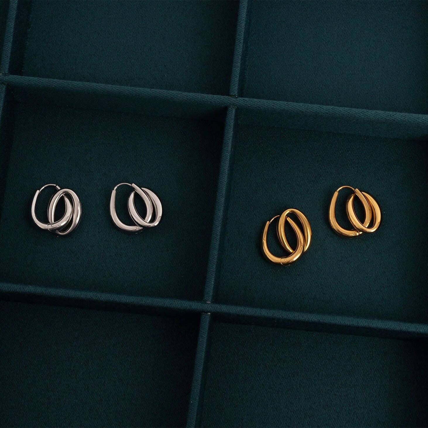 Two hoops. One effortless statement. This 18K Gold PVD stainless steel design features a sleek huggie with a second floating hoop that swings for subtle movement and shine. Water‑resistant, tarnish‑resistant, and lightweight, it’s the easy upgrade for everyday denim or a night out. Wear solo for clean polish or stack with studs and cuffs for a layered look.