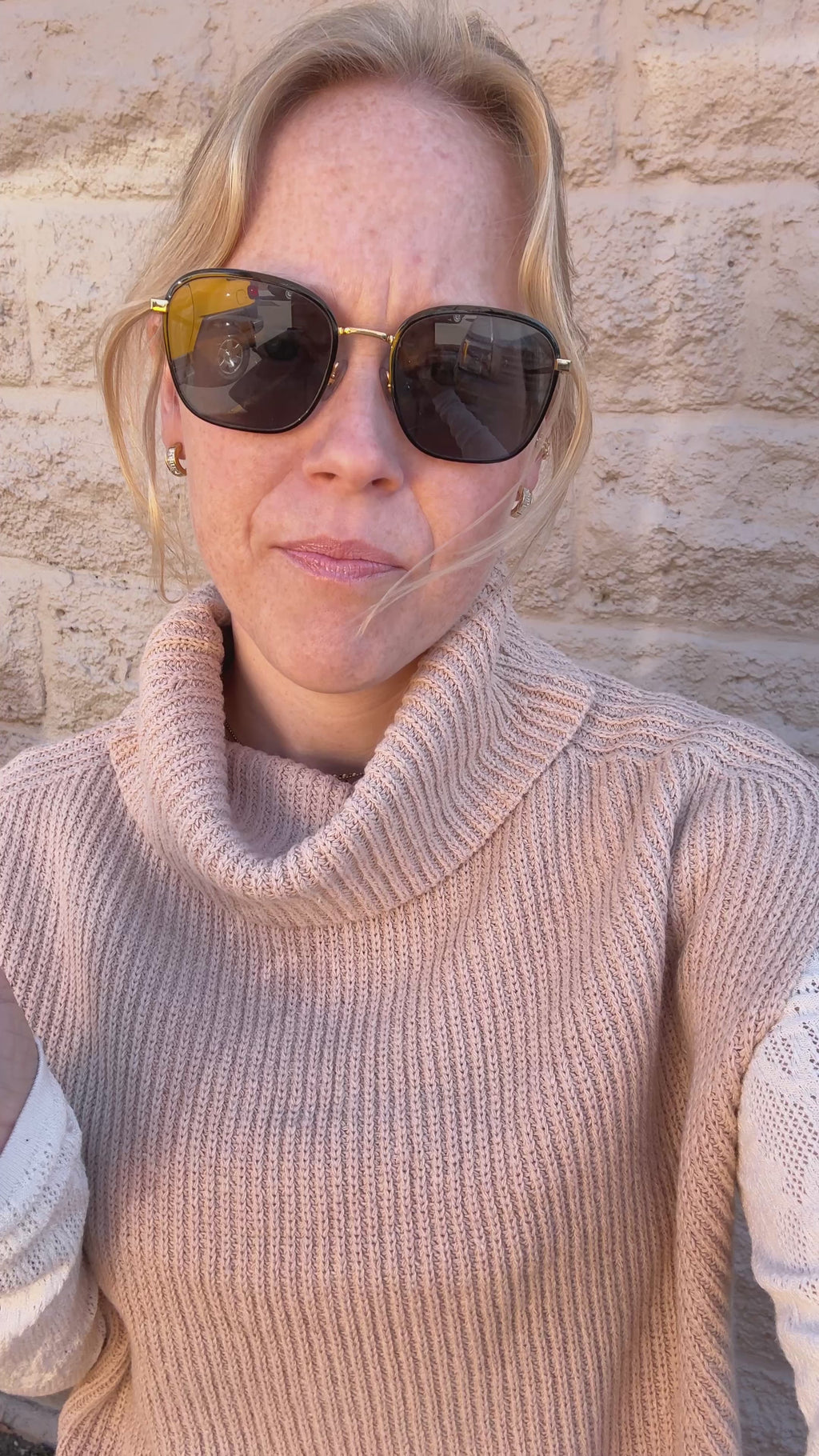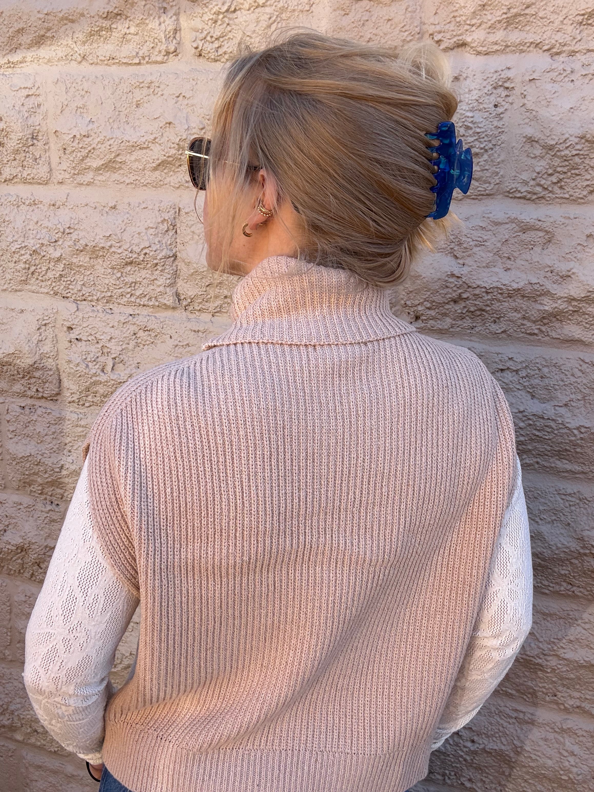 The Crosby!! She is a stunning ribbed sweater vest with a comfy-cozy turtleneck. The light almond color adds a natural flair that pairs beautifully the soft ribbed knit. It’s stunning!!