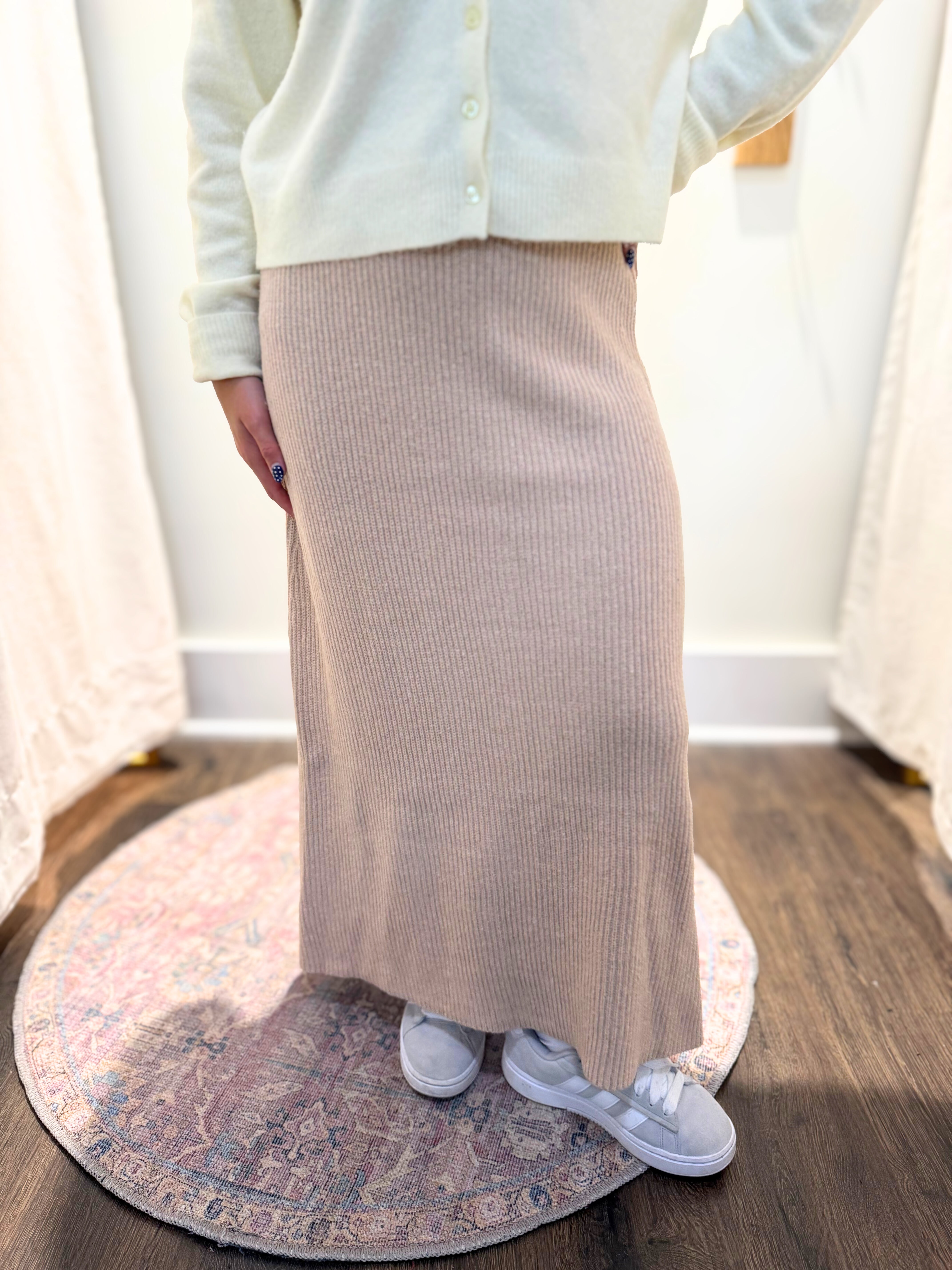 The Crosby midi skirt is begging to go home with you! She is so wildly soft with a beautiful tan knit. The sweater skirt is everything you could want!