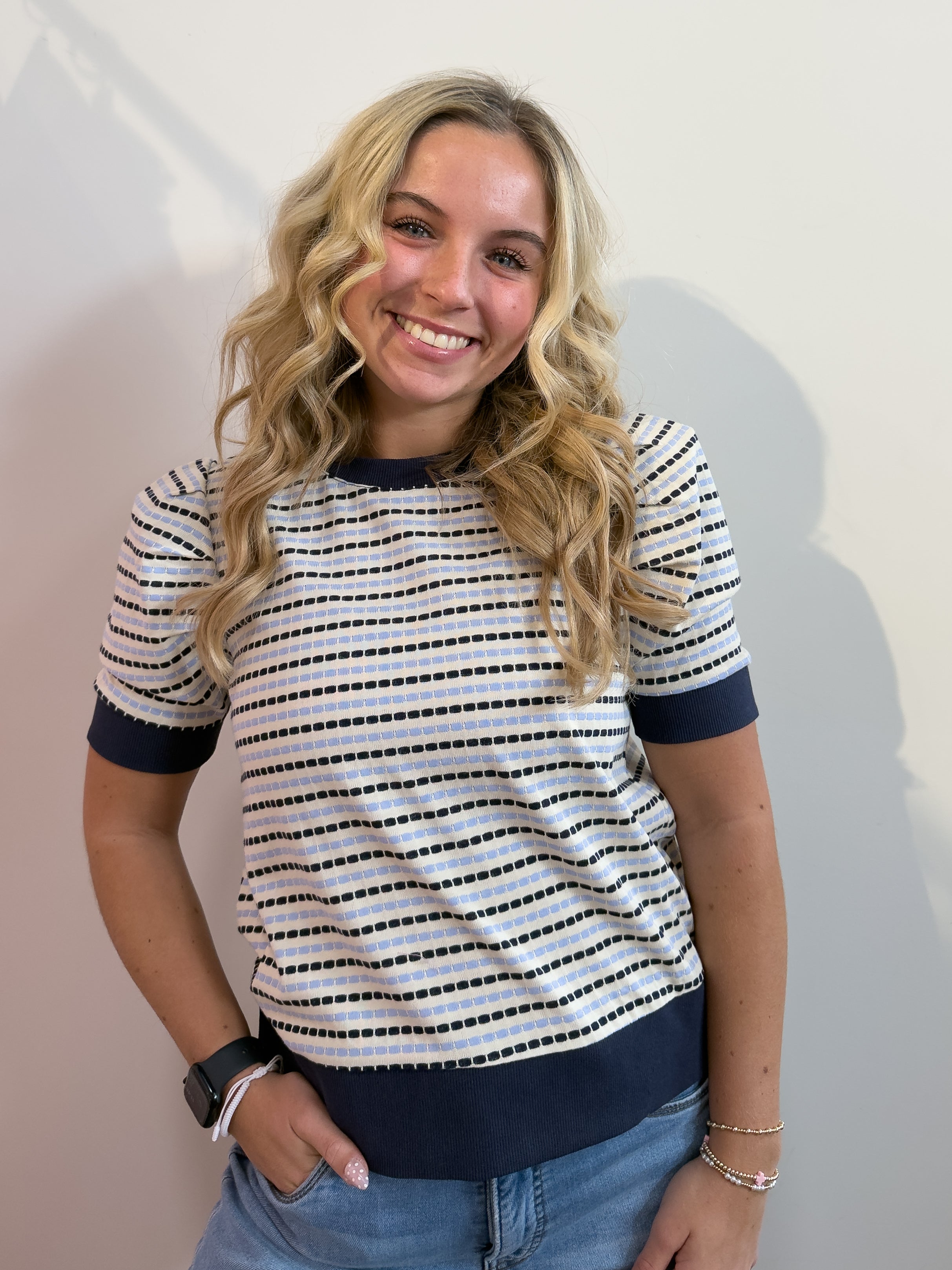This charming sweater features easy puff sleeves that for the perfect arm coverage, while the soft, stretchy fabric is comfy and flattering. The timeless trio of cream, pale blue, and navy creates an effortlessly chic look that pairs with everything in your closet. Perfect for layering or wearing solo, it's the kind of piece you'll reach for again and again.