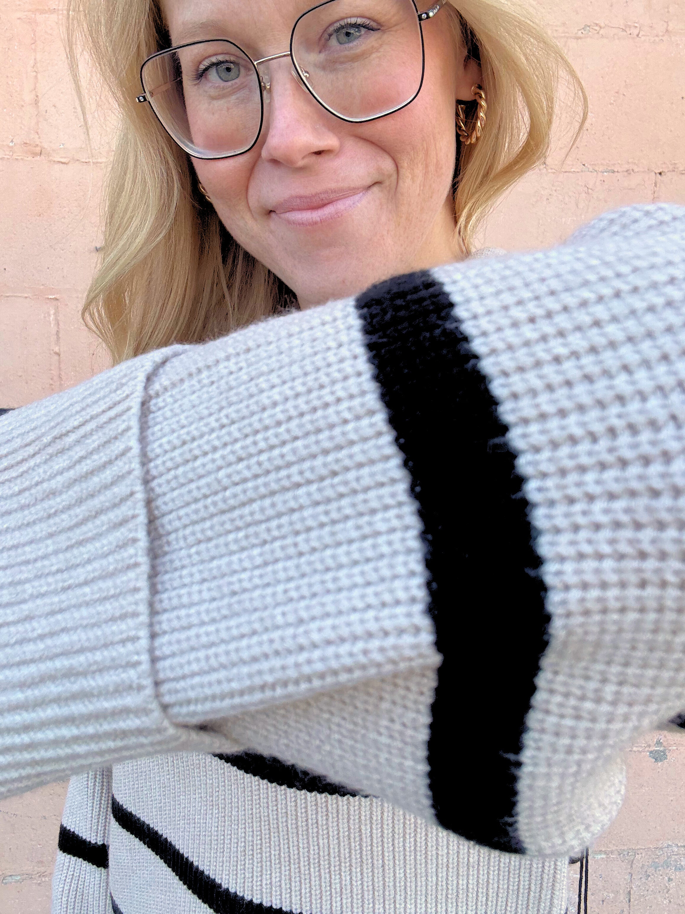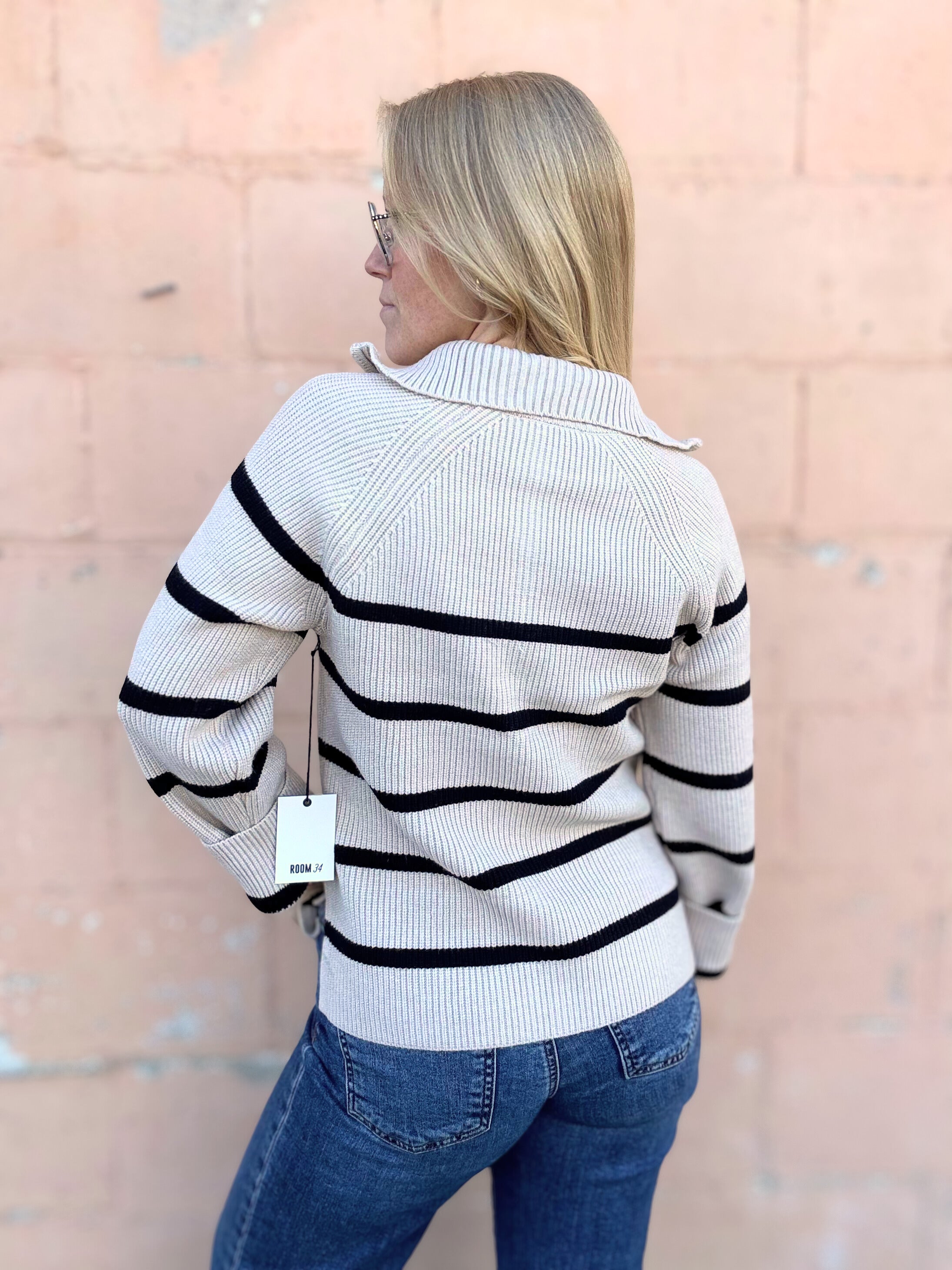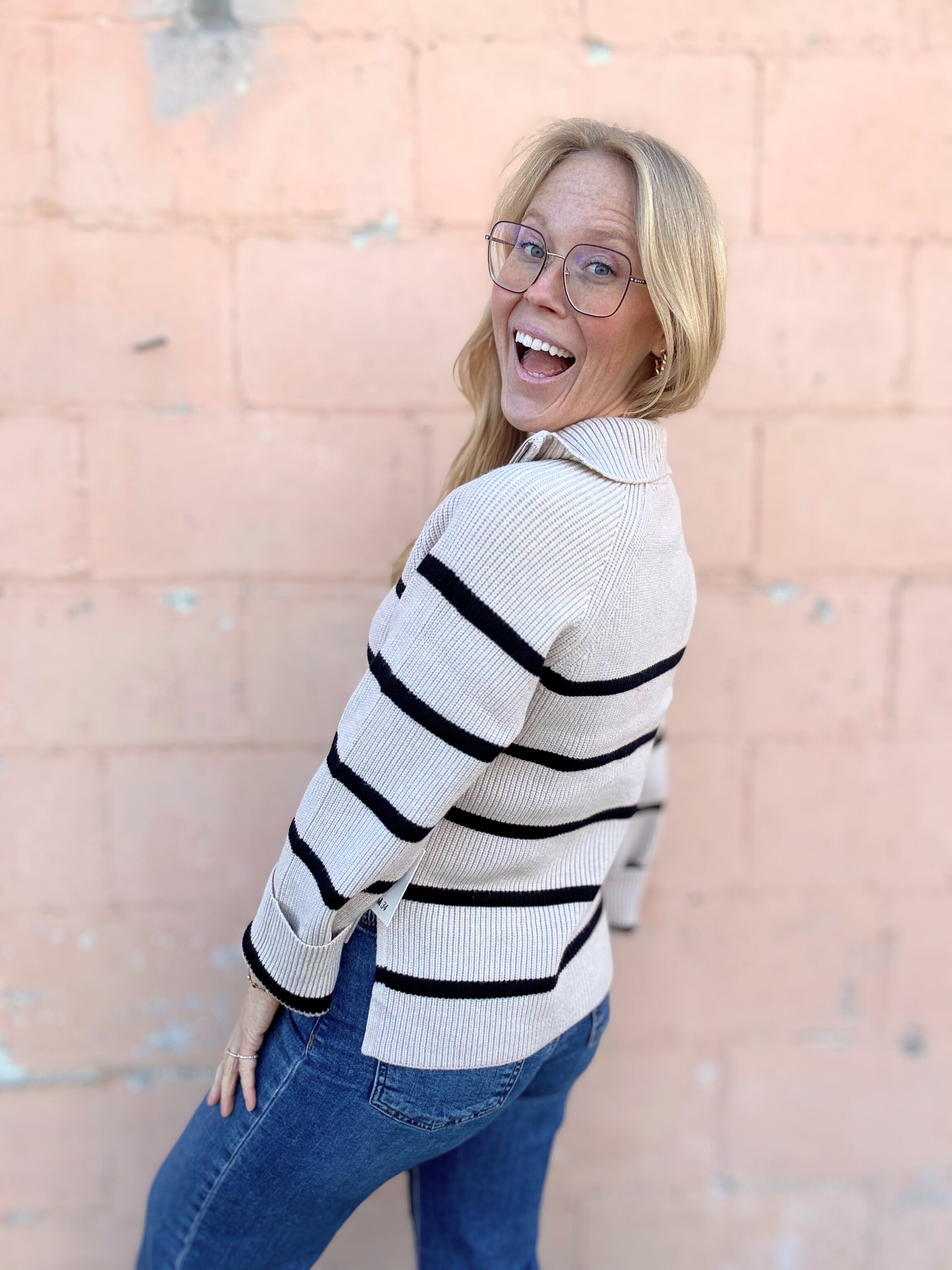 Simple. Cozy. Elevated- is that a thing? Well we think so with this perfectly simple, cozy and elevated sweater. She has a classic fit with a cute silver half zip. She is an oat color with black stripes. It feels like butter while you’re wearing it and keeps you warm on the upcoming cold days. This is a must!