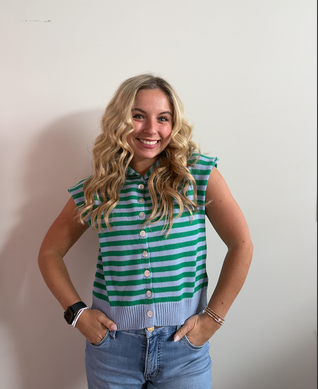This striped sleeveless sweater is your new wardrobe MVP! Featuring soft pale blue and green stripes with charming button details, it's equally stunning worn solo or layered over your favorite crisp white shirt. The perfect piece for those in-between seasons when you want just the right amount of coverage without the bulk.