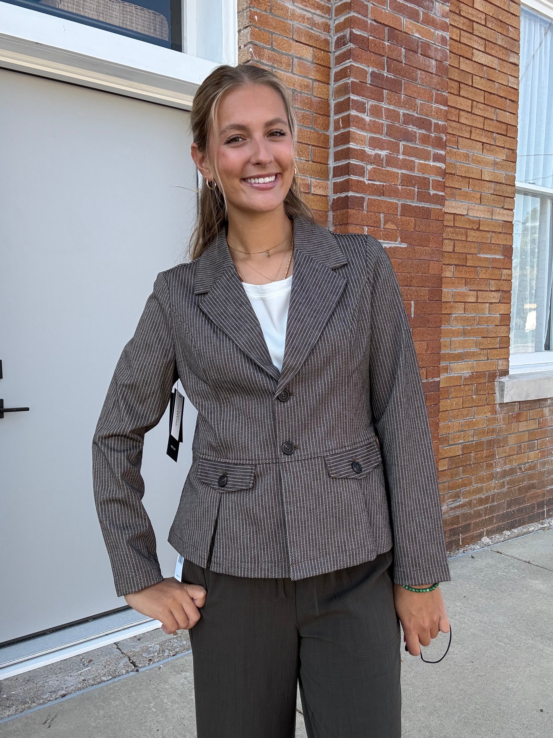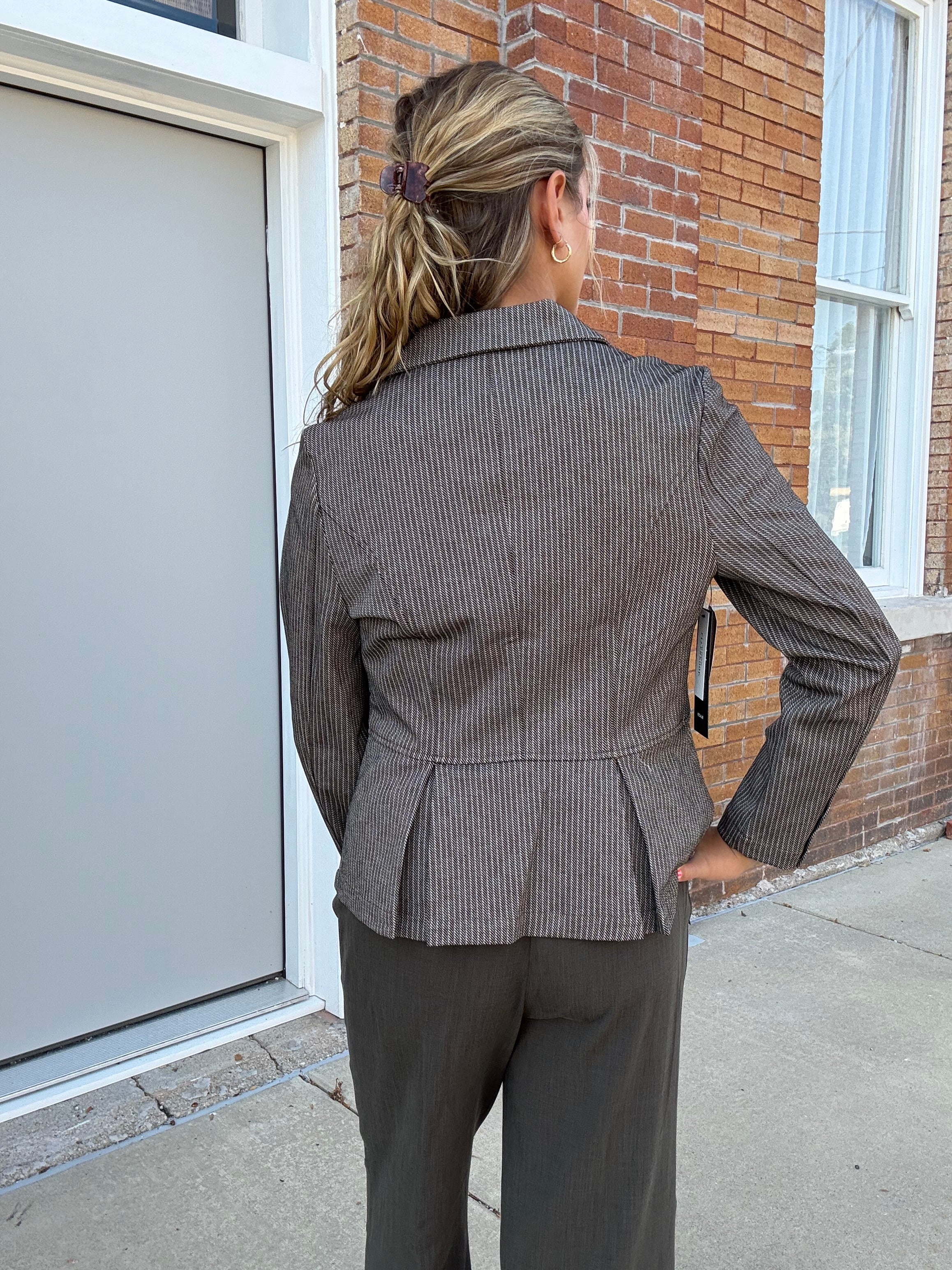 In a polished camel sand stripe, this blazer is tailored with a peplum silhouette that creates a flattering, feminine shape. The box-pleated hem adds subtle movement, while the polished design makes it easy to style from desk to dinner. A modern statement piece that elevates any look.